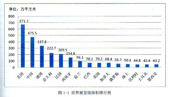 以展館面積大小排序,2013年世界展覽館十大國家為:美國第一,671. 2萬平方米;中國第二,475.5萬平方米;德國第三,337 .8 萬平方米;意大利第四,222.7萬平方米:法國第五,209. 5萬平方米:西班牙第六154.8萬平方米;荷蘭第七,.96 .1萬平方米;巴西第八.70. 2萬平方米;英國第九.70 .2萬平方米;加拿大第十,68.4萬平方米。其他還有俄歲斯(56. 7萬平方米)、瑞士(50.1萬平方米)、比利時(44. 8萬平方米)、土耳其(43.4萬平方米)、墨兩哥(43 2萬平方米),這15個國家的展館占全球展覽面積的80%。其中,美國、中國、德國、意大利和法國,這前五強國家的展館面積更是達到全球60%以上。
