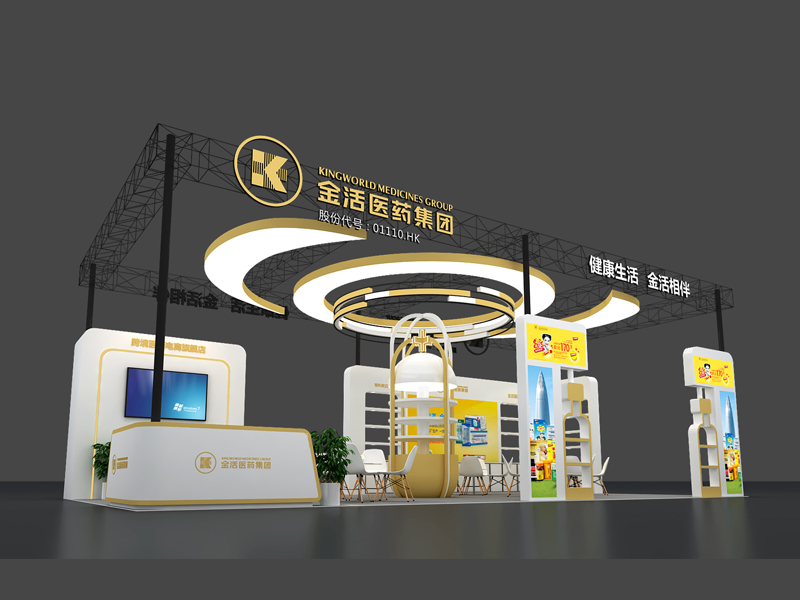 契合陽普醫(yī)療的品牌形象和產(chǎn)品特性,展位從中間切開分為上下層,巧妙地擴大展位可利用面積,再搭配燈具燈光的效果,襯托出展位自由、祥和的氛圍,突出一種優(yōu)雅、明朗的時尚品味。