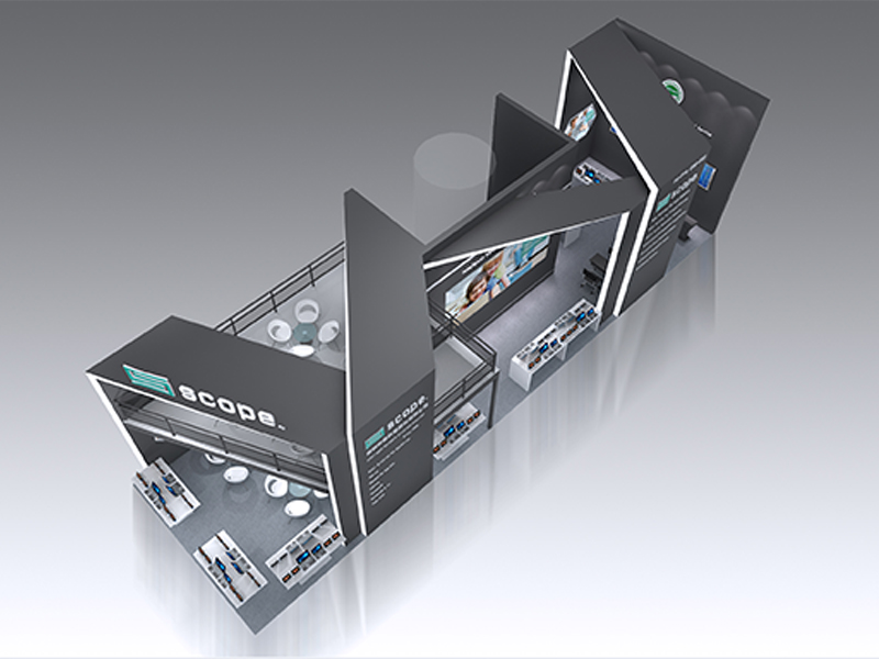 希科普——教育展展臺搭建,契合??破盏钠放菩蜗蠛彤a(chǎn)品特性,采用雙層結(jié)構(gòu),再搭配燈具燈光的效果,襯托出展位科技舒適的氛圍,展示了一種簡潔、硬朗的風格。