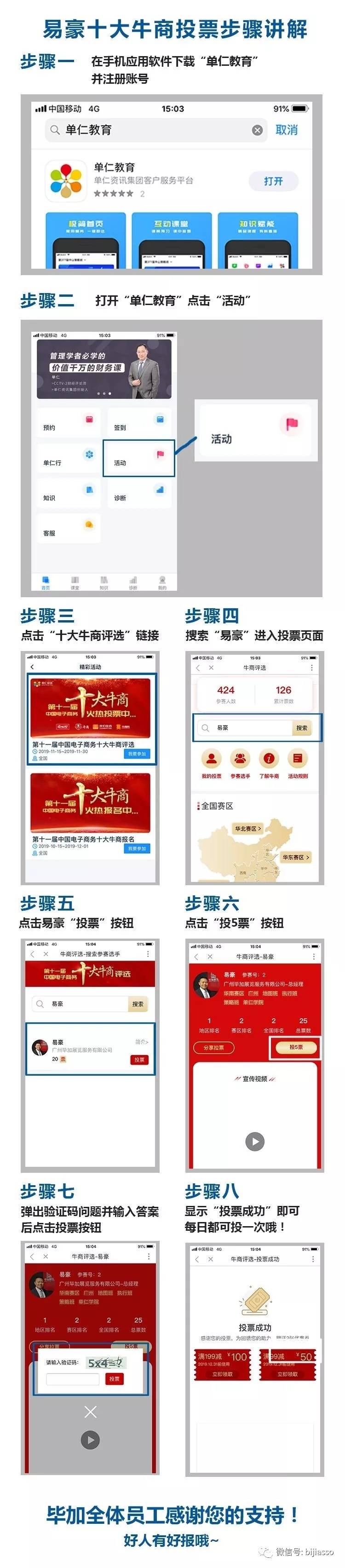 第十一屆全國十大牛商評選,此評選活動覆蓋了全國20多個城市,全國超12萬家企業(yè)參與其中,300多萬企業(yè)家實名投票,吸引眾多媒體爭相報道 ! 易總裁也是想通過此次活動打造品牌價值,提升知名度和競爭力。活動總共分為兩輪,第一輪是參加廣州區(qū)域十大牛商爭奪賽,第二輪是全國十大牛商碾壓賽。第一輪晉級才能進入第二輪,第一輪的30%評分標準是通過網(wǎng)上投票,所以在此希望我們畢加這個大家庭都能夠在11月16號到11月30號期間都能夠為我們的易總裁投上寶貴的一票。人人獻出一張票,易豪馬上就出道。