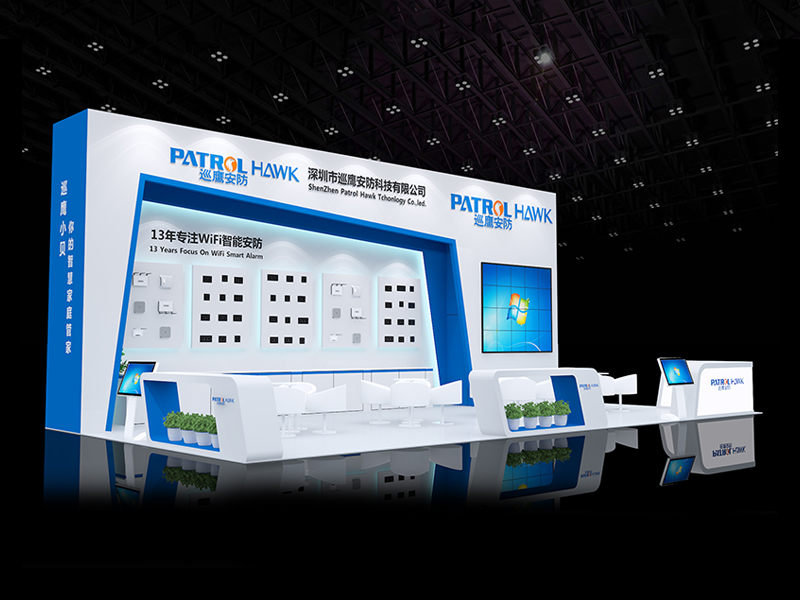 巡鷹安防——安防展展臺(tái)搭建,契合巡鷹安防產(chǎn)品品牌形象和產(chǎn)品特性,采用藍(lán)白色彩,再搭配燈具燈光的效果,襯托出展位簡(jiǎn)約、科技的氛圍,突出一種簡(jiǎn)約、先進(jìn)的時(shí)尚品味。