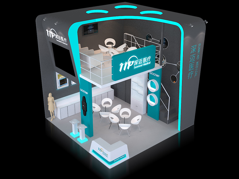 美達(dá)爾——醫(yī)療器械展設(shè)計(jì)搭建,契合曼紐科的品牌形象和產(chǎn)品特性,巧妙地?cái)U(kuò)大展位可利用面積,再搭配燈具燈光的效果,襯托出展位自由、科技的氛圍,突出一種簡(jiǎn)潔、明朗的時(shí)尚品味。
